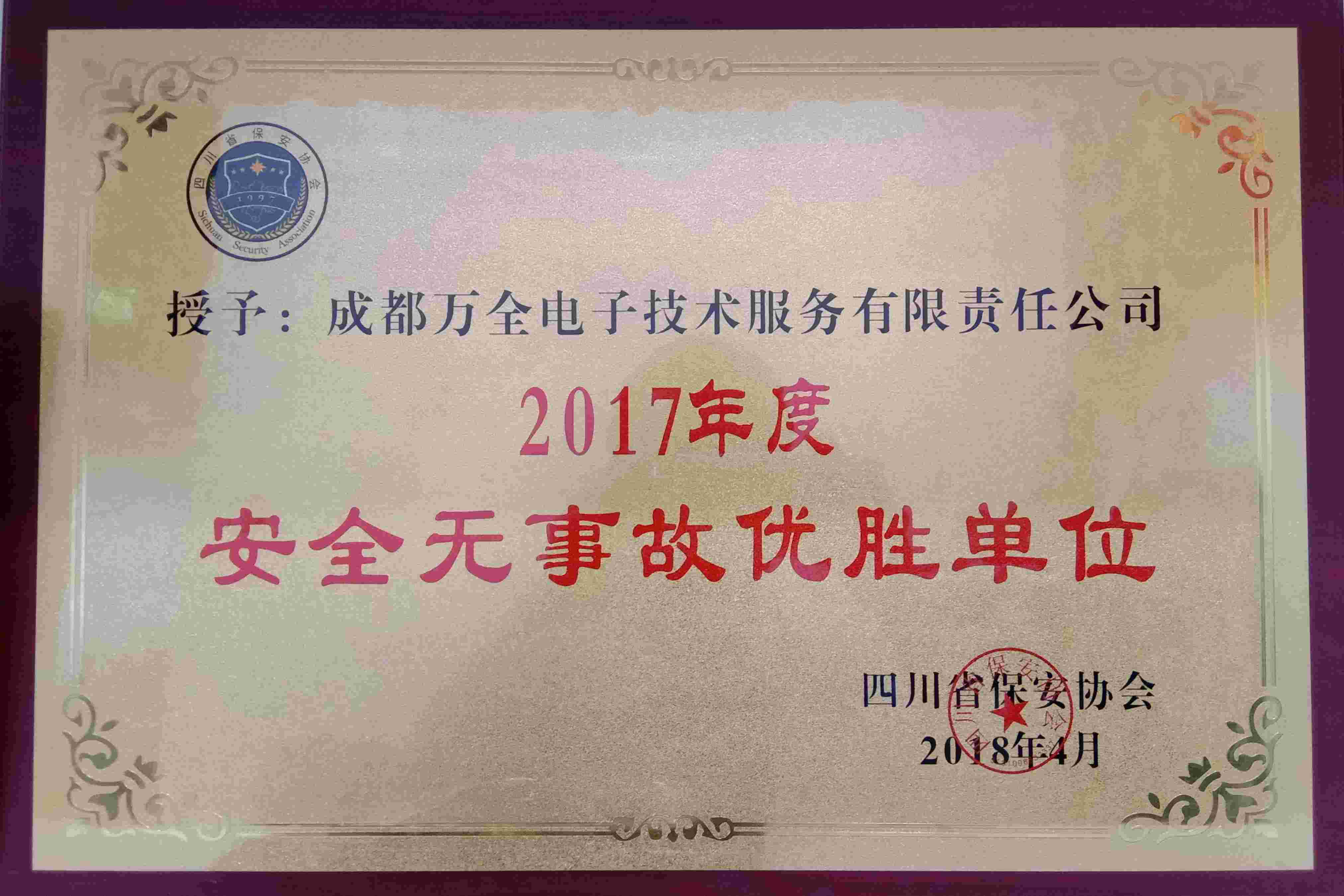 2017年4月四川省安保協會授予安防集成商成都萬全電子“2017年度安全無事故優勝單位”稱號